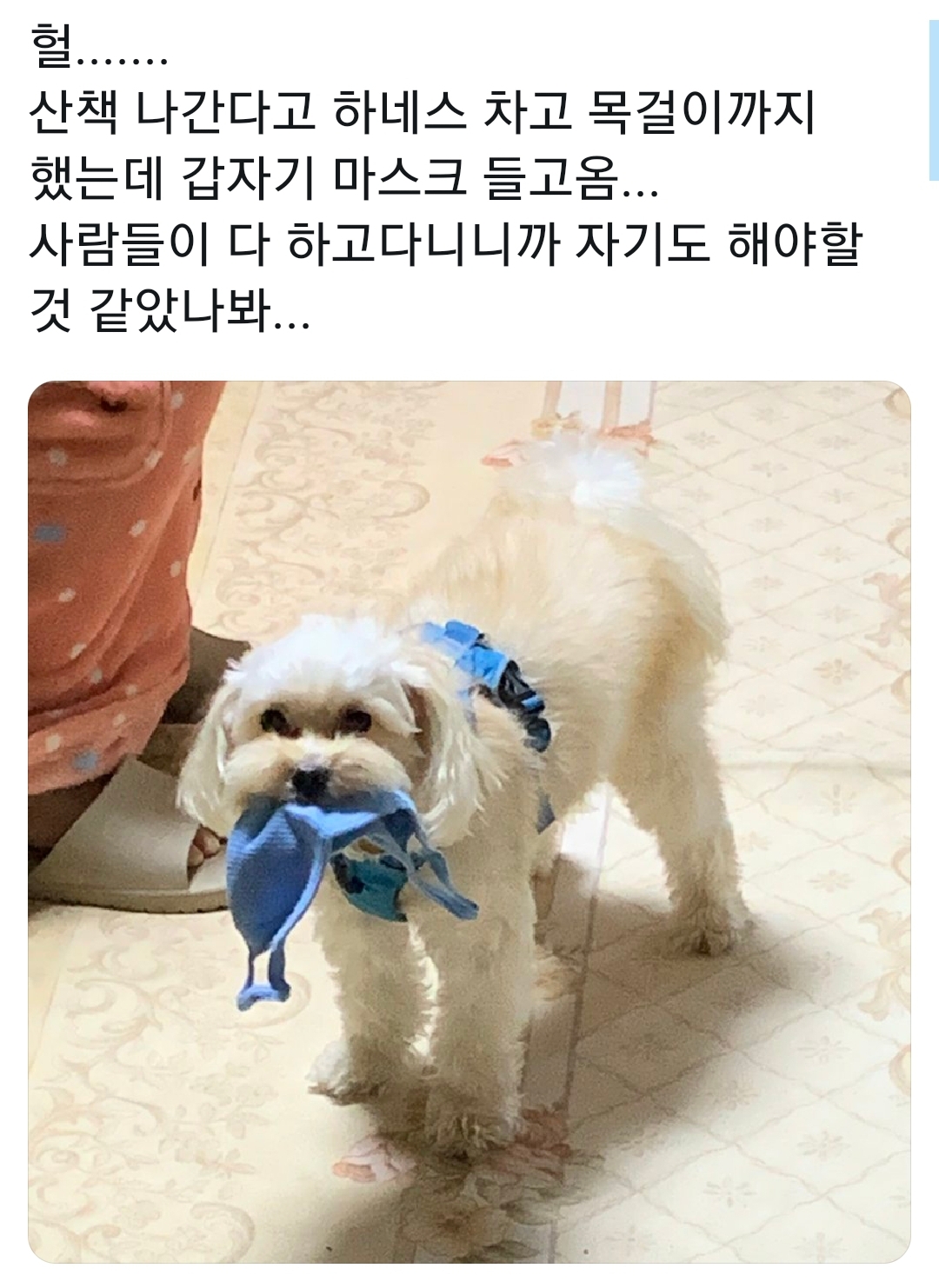 The owner wears a mask every time he goes out, so it looks like he brings a mask like his harness.